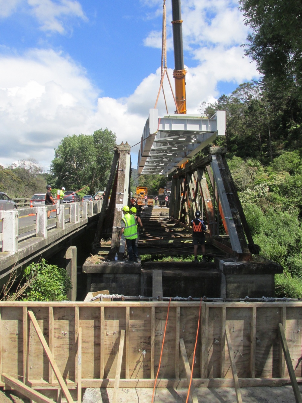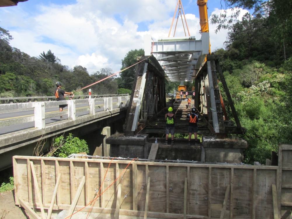 Lowering bridge section into place.
